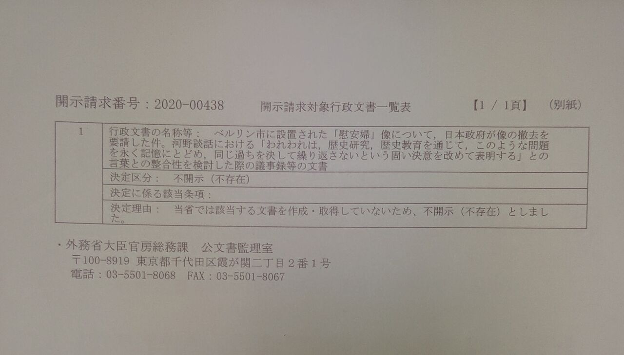僕「ベルリン市に設置された「慰安婦」像について、日本政府が像の撤去を要請した件について。河野談話との整合性ってどうなってますか?検討しました?」